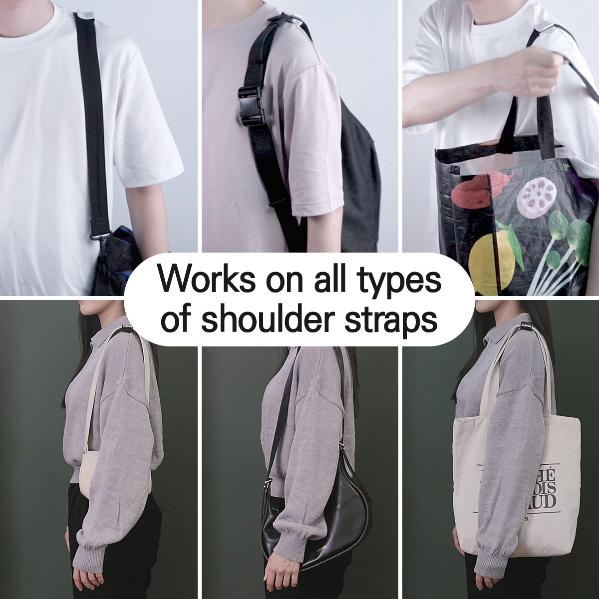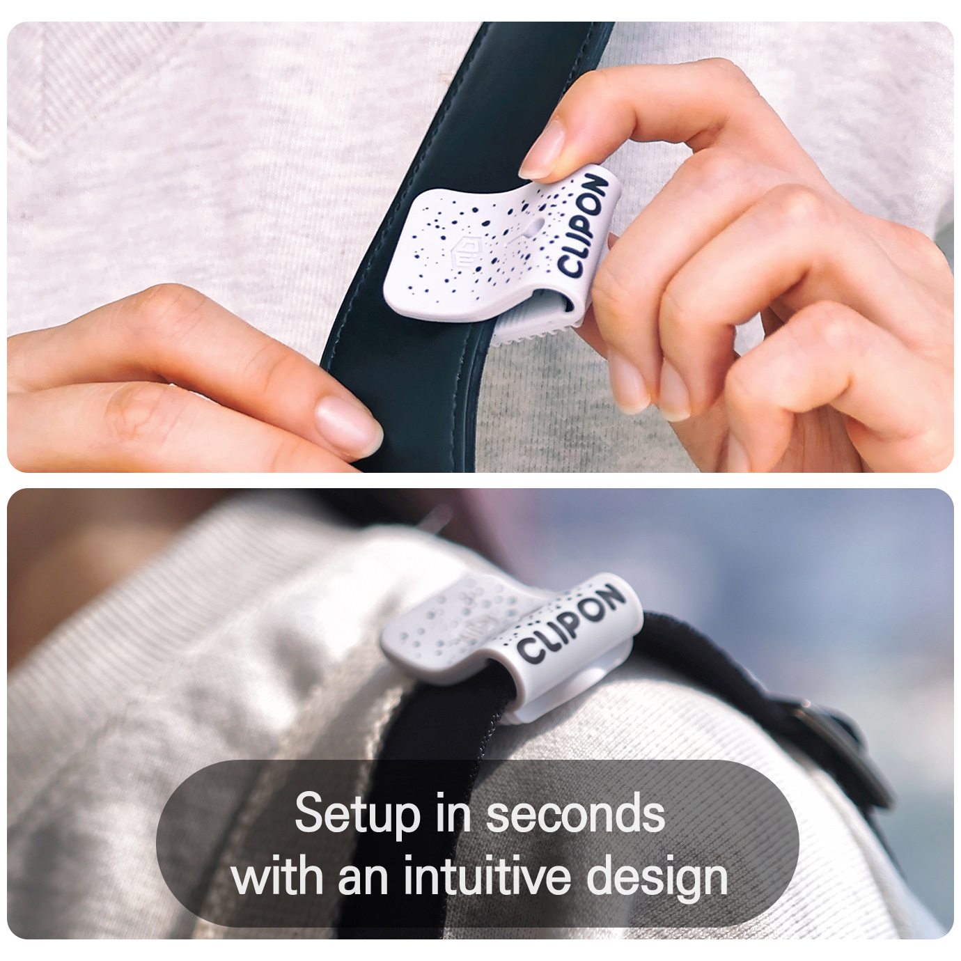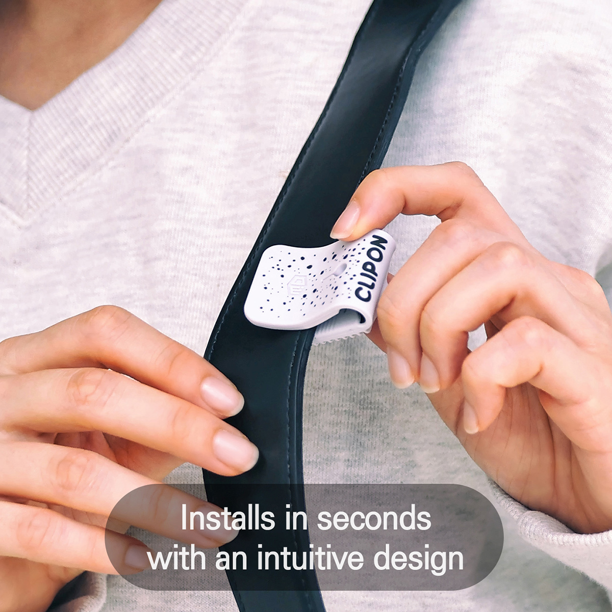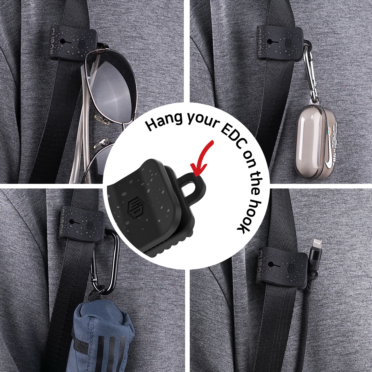 • Clipon is an anti-slip clip that easily attaches to your bag straps in a second, allowing for versatile use.